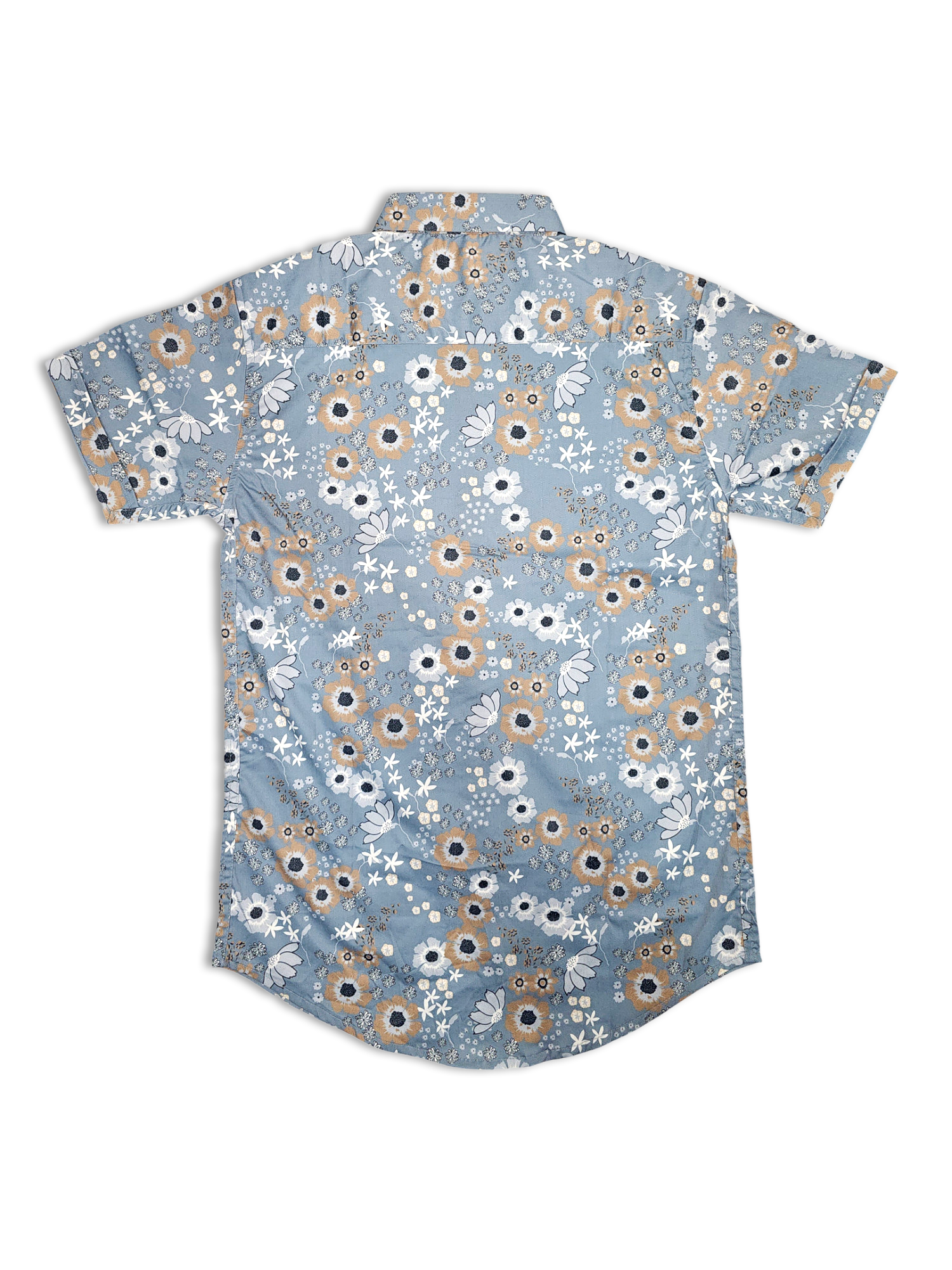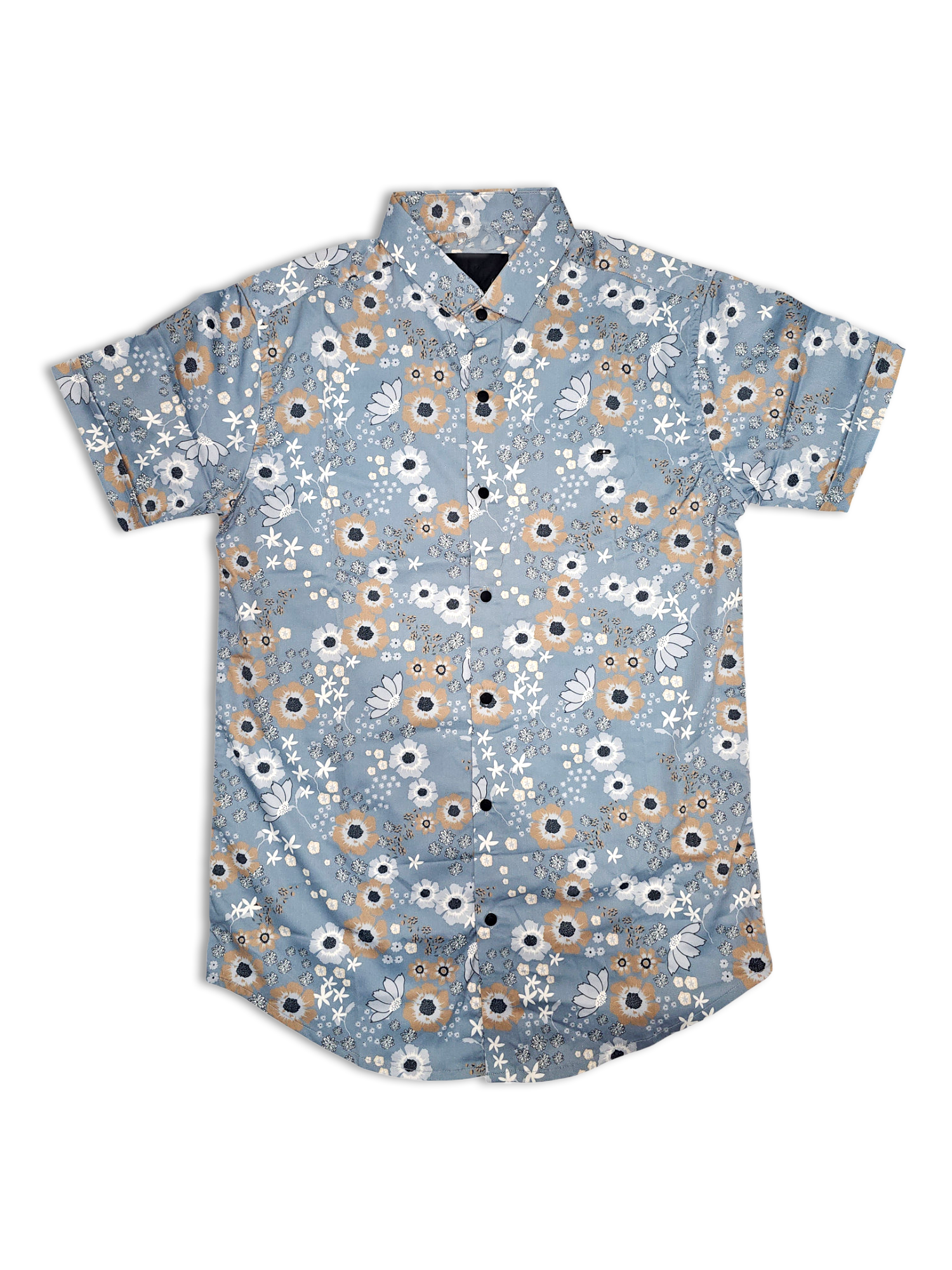 Elevate your style with this slim-fit short-sleeve shirt, featuring a vibrant floral print design in soft blue, beige, white, and subtle black accents. Crafted from a poly-cotton blend, this shirt offers a luxurious, silky-smooth touch with breathable comfort, making it perfect for any occasion, from casual outings to semi-formal gatherings.